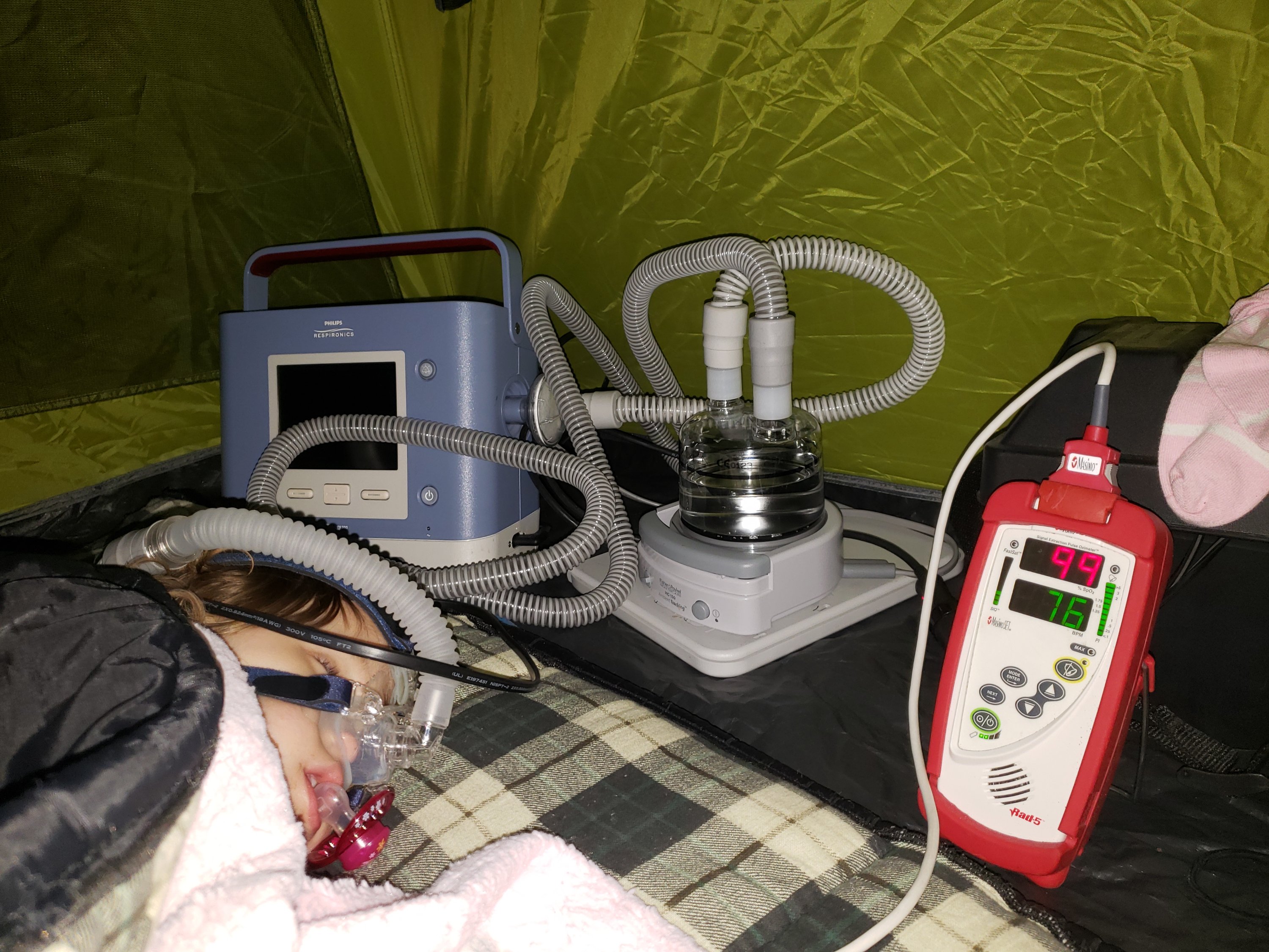 When we first found out she would be coming home from her shunt revisions with as bipap, we had already paid-for plans for camping. We could have cancelled. We could have split up, with one of us taking the other kids while the other stayed home with Evanna. Instead, we said how can we still include Evanna in our camping plans. The answer included the purchase of a generator and a battery-operated pulse oximeter, the help of several friends, and a whole lot of pre-planning, but she went camping.