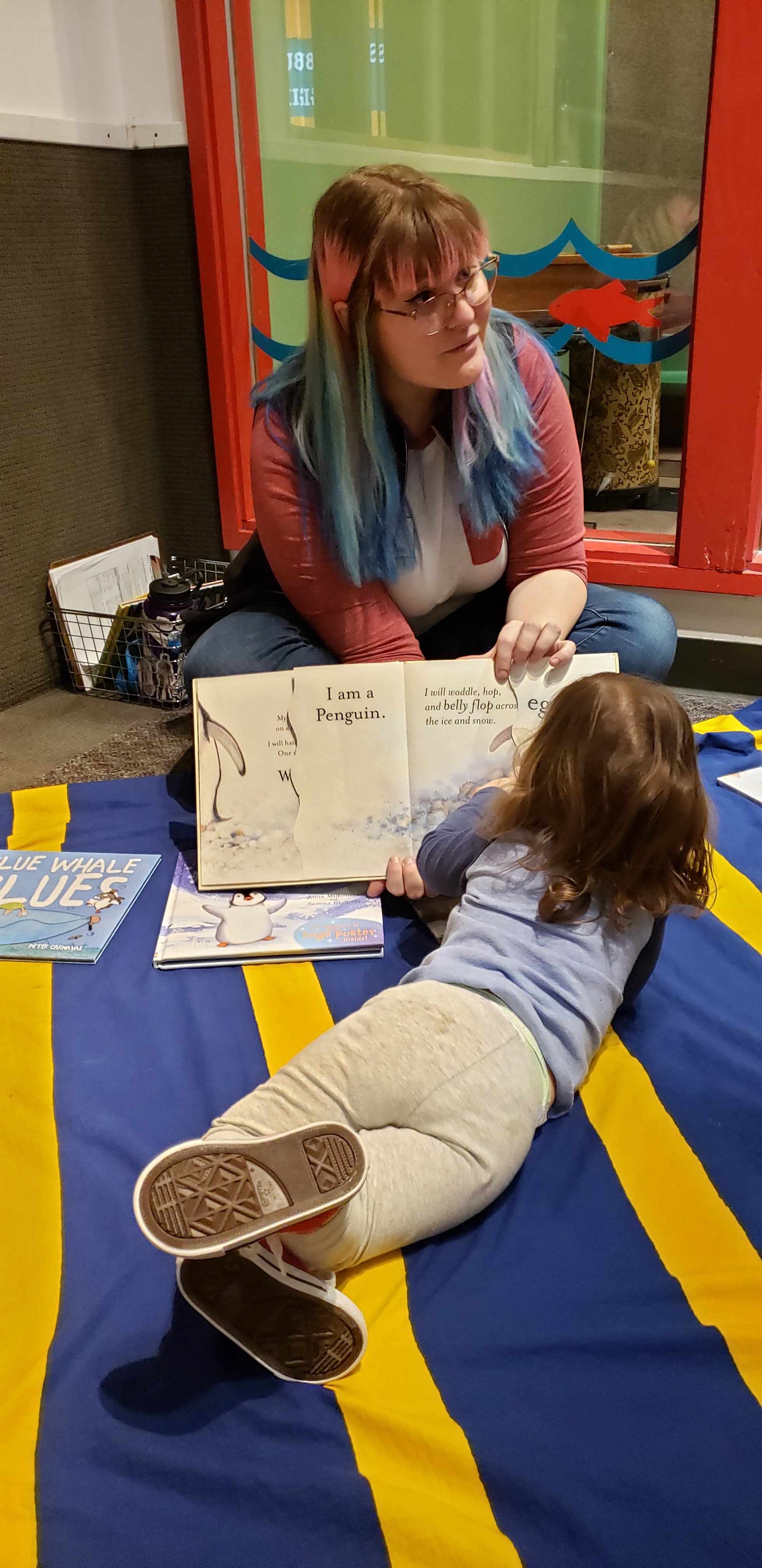 There was someone reading a book to kids interested in listening. She crawled up and helped open the flaps. The other child listening given a chance to open flaps too.