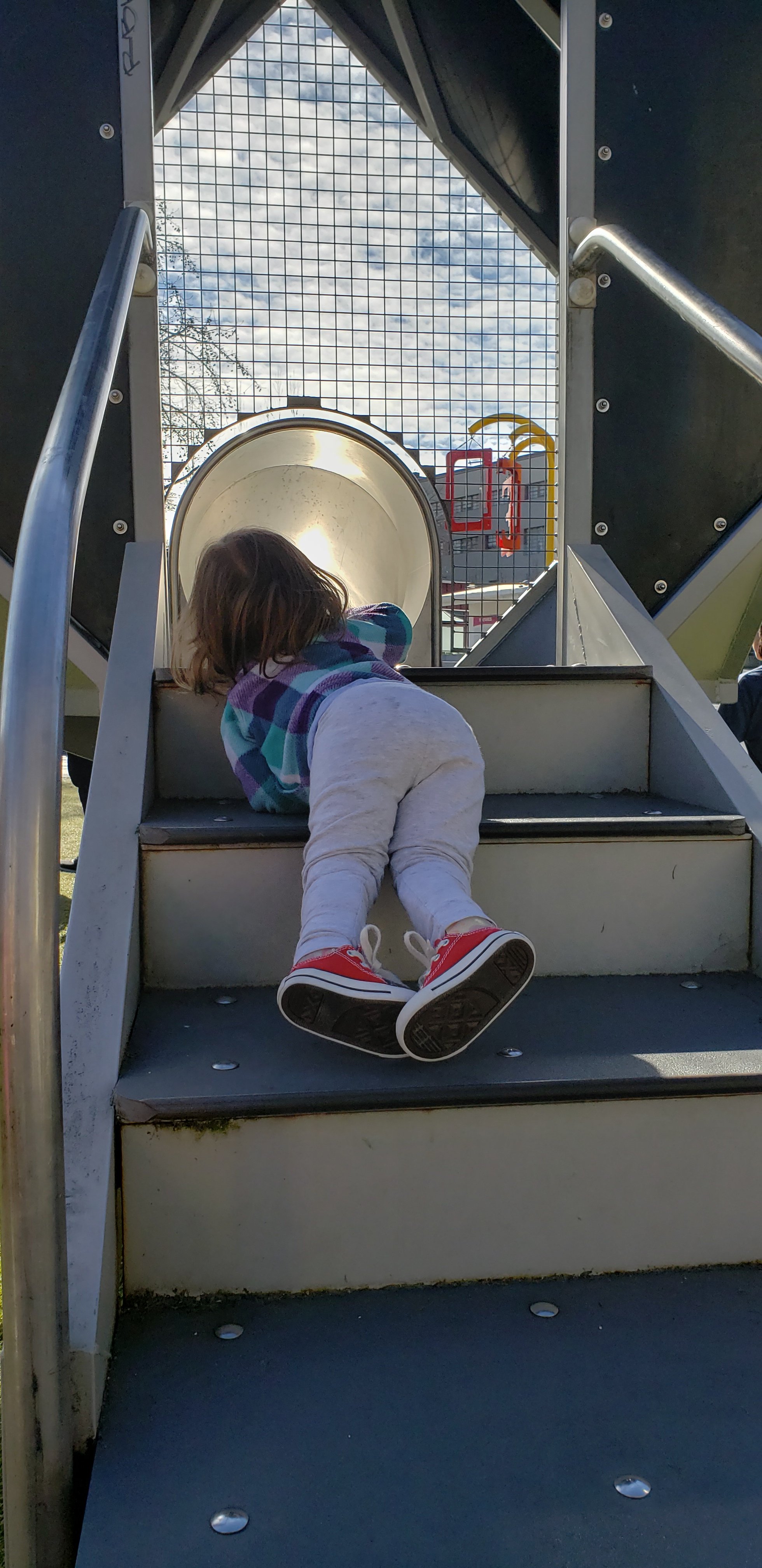 She crawled up the steps of the little kid structure and slid down…face first, of course. (Sarcasm font because we’ve taught her to always go feet first.)